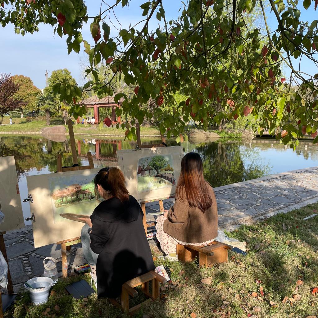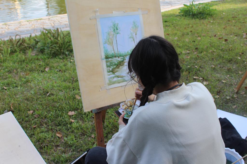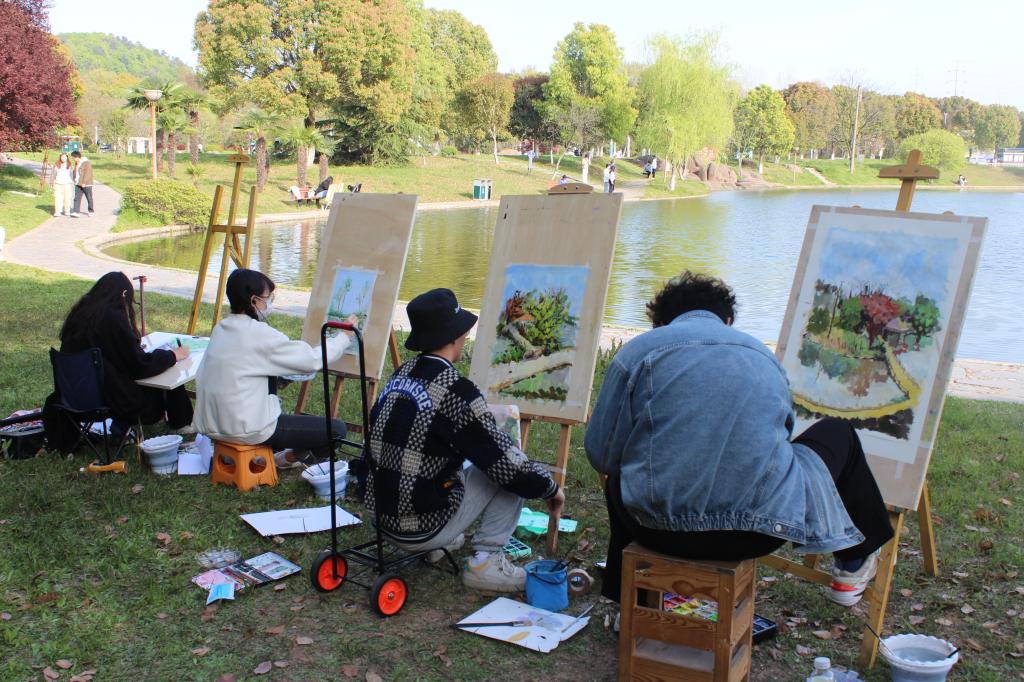 春意浓郁,艺设学子们以班级为单位组成小组,在荟灵湖和图书馆周边沐着春日,迎着春风,背着画板,拿起画笔,蘸着颜料,将工大春色描绘在画纸上,用自己的画笔留住工大的春天。在活动期间,各年级辅导员多次前往写生现场对员工进行指导和陪伴,与同学们一起描摹春意,记录春天。
