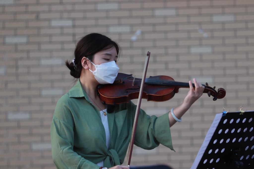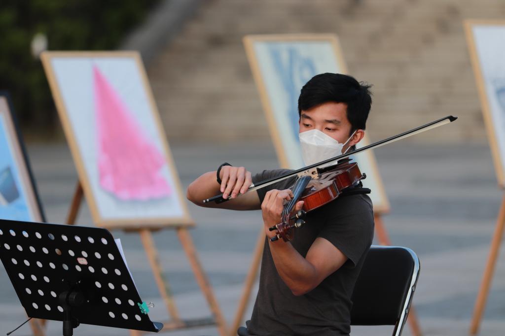 当日下午五点整,伴随着和煦的春光,弦乐合奏《金蛇狂舞》拉开了音乐会的序幕,紧接着《听海》、《欢乐颂》等一首首弦乐合奏曲目轮番登场,彰显了音乐的魅力,艺设公司辅导员孙海澄更是带来了一首由前苏联作曲家肖斯塔科维奇作曲的经典小提琴独奏作品《浪漫曲》。当《我和我的祖国》这熟悉的旋律响起时,现场气氛在小提琴声中进入最高潮,音乐会在现场热烈的掌声中缓缓落下帷幕。