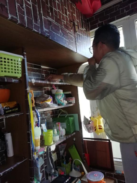 辅导员李亚飞和宿舍管理员王连华首先统一打开宿舍门和阳台的门窗进行通风,连续对宿舍通风两天,并计划开学前两天再对员工宿舍通风一天,保证宿舍空气对流三天,最大化去除屋内的湿气和霉气;其次对员工被褥逐个做检查与整理,对于出现发霉的床铺,两位老师将发霉的被褥、席子拿到广场或阳台晾晒并拍打掉被褥上的霉菌,为防止出错,还在每条被褥上贴上事先准备好的标签;同时两位老师再次清理了宿舍各个角落里已开封的食品、水果或者其他垃圾,并将部分腐烂、风干、过期的食物清理出去;最后两位老师还检查每个宿舍中潜在的安全隐患,进一步检查员工宿舍内的桌椅、水电以及墙壁等设备设施情况。
