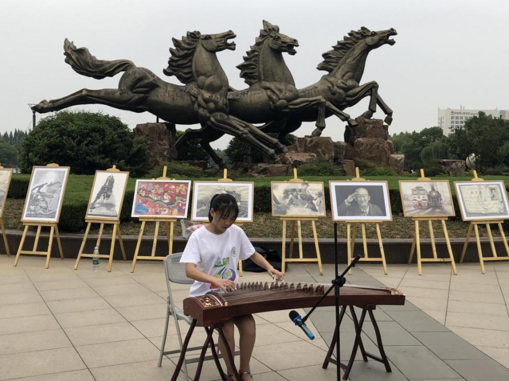 “美育浸润”实践队队员刘婕妤在南湖公园演奏古筝经典曲目《渔舟唱晚》