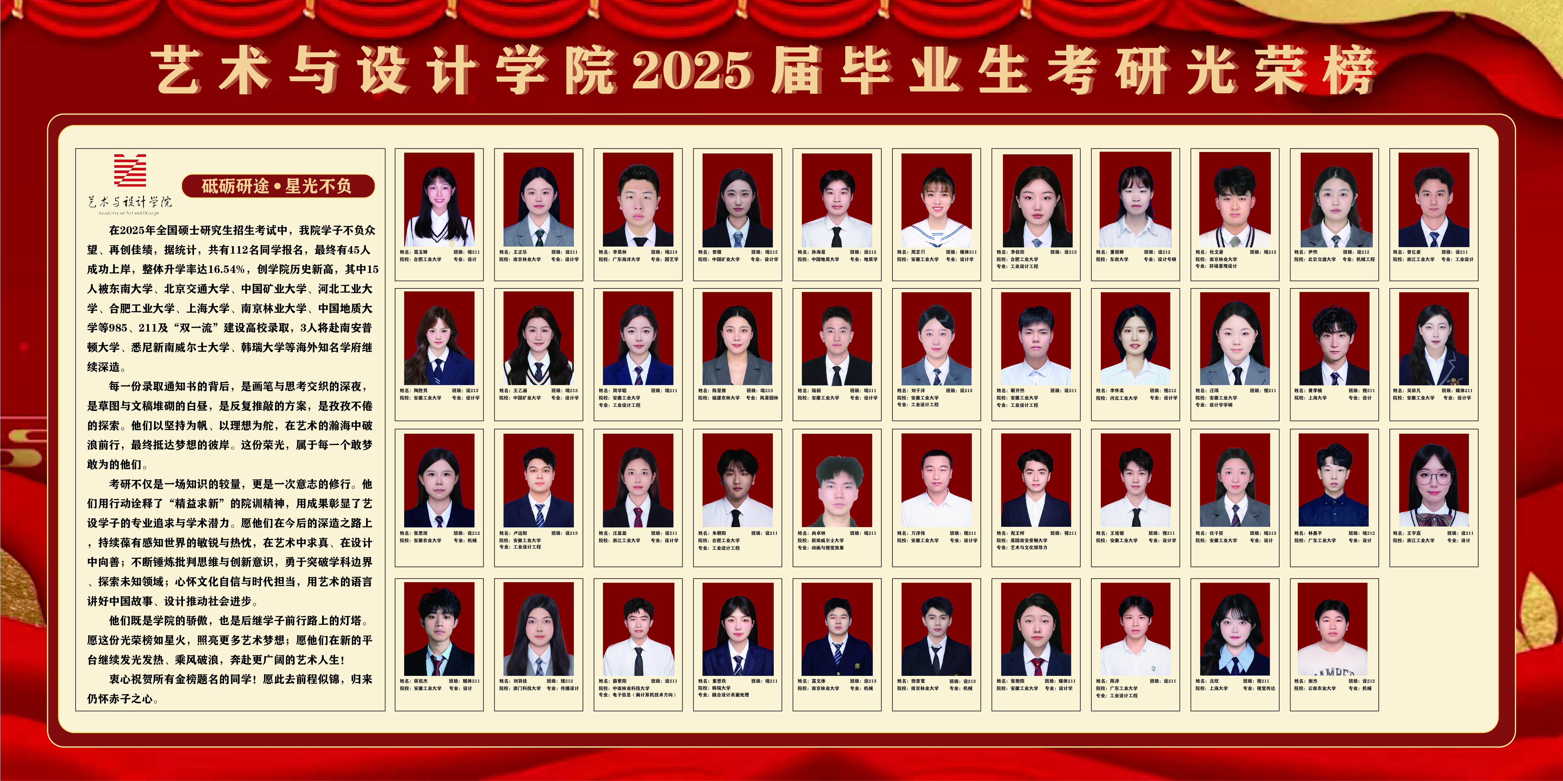 艺设学子们用行动诠释了“精益求新”的院训精神,用成果彰显了艺设学子的专业追求与学术潜力。愿他们在今后的深造之路上,持续葆有感知世界的敏锐与热忱,在艺术中求真、在设计中向善;不断锤炼批判思维与创新意识,勇于突破学科边界、探索未知领域;心怀文化自信与时代担当,用艺术的语言讲好中国故事、设计推动社会进步。