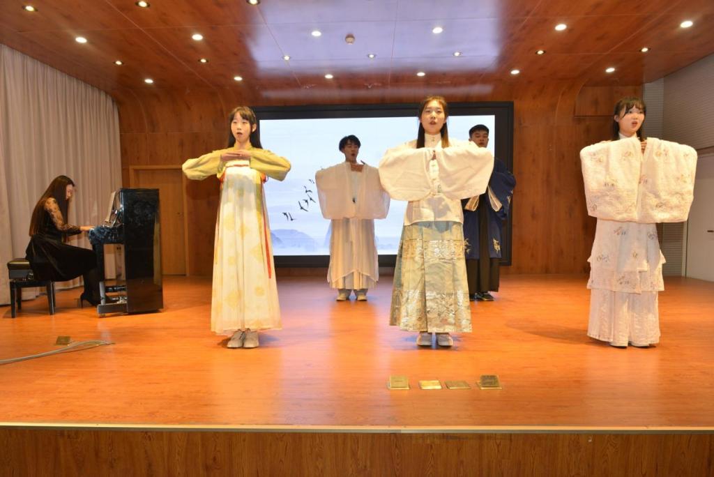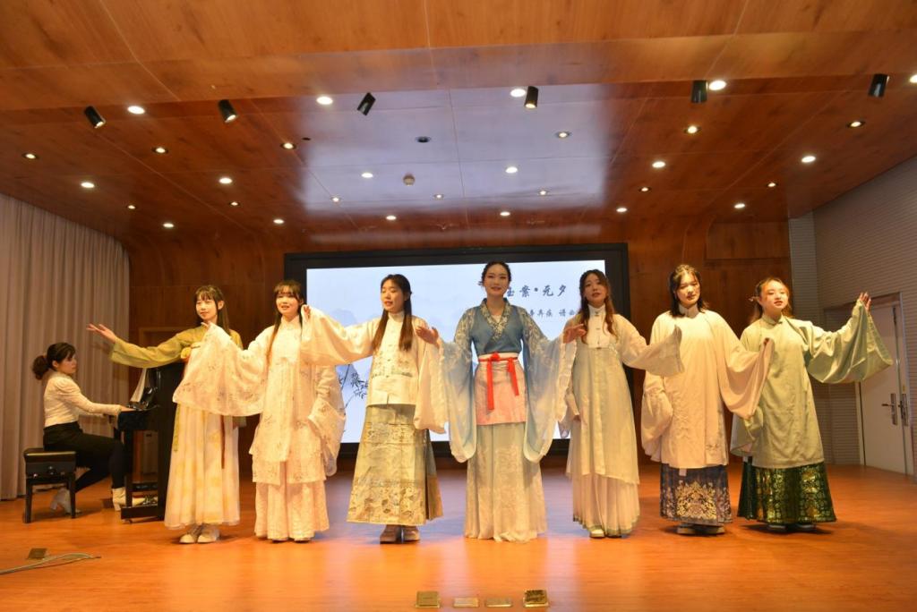 《阳关三叠》、《花非花》、《越人歌》这些耳熟能详的诗词以音律为载体,或叹别离、或颂真情、或思人生,唱出人生百味,在动人韵律中重现古人真挚的情感。男声雄浑、女声温婉,相辅相成,韵味深永。钢琴独奏《山火》以欢快激昂的节奏,点燃全场,掌声喝彩迭起,将氛围推向高潮。钢琴、古筝合奏《红颜劫》情感真挚、曲调动人,中西音乐文化亦在琴音交织间交融碰撞。《点绛唇·赋登楼》、《红豆词》、《青玉案·元夕》等词曲的演绎生动婉转,展现了古代人民饱满充盈的精神世界和对美好生活的热情追求,曲声悠扬,充满开阔朦胧的浪漫气息,尽显中国古诗词音乐的意境之美。听赏会在合唱《水调歌头》圆满落幕,余音绕梁、掌声不断。