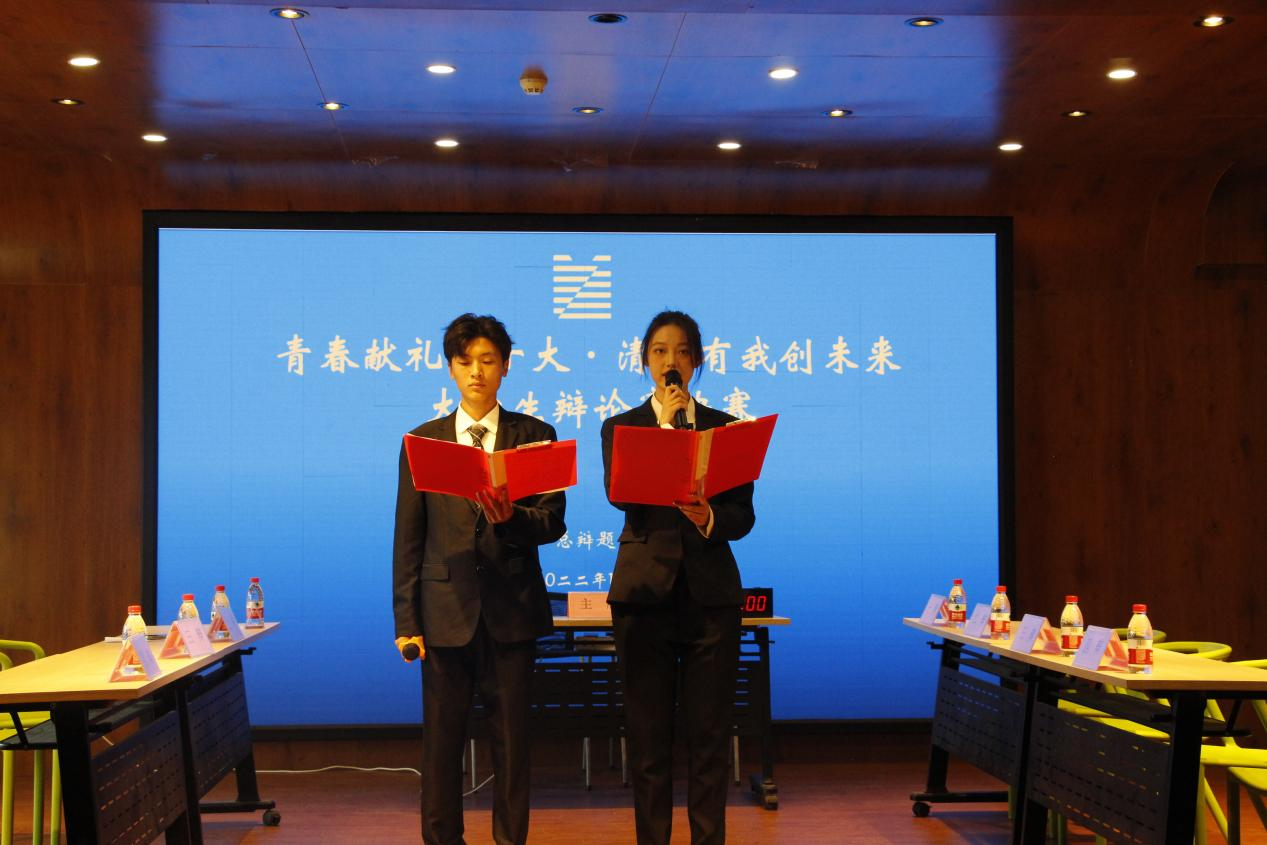 10月15日下午,艺设公司举办“青春献礼二十大,青春有我创未来”辩论赛决赛。由党委书记张为清,党委副书记、副经理方勇,院团委书记、2020级辅导员汪正,2021级辅导员罗凡,2022级辅导员秦艳秋担任评委,2021级、2022级员工观看此次辩论赛。