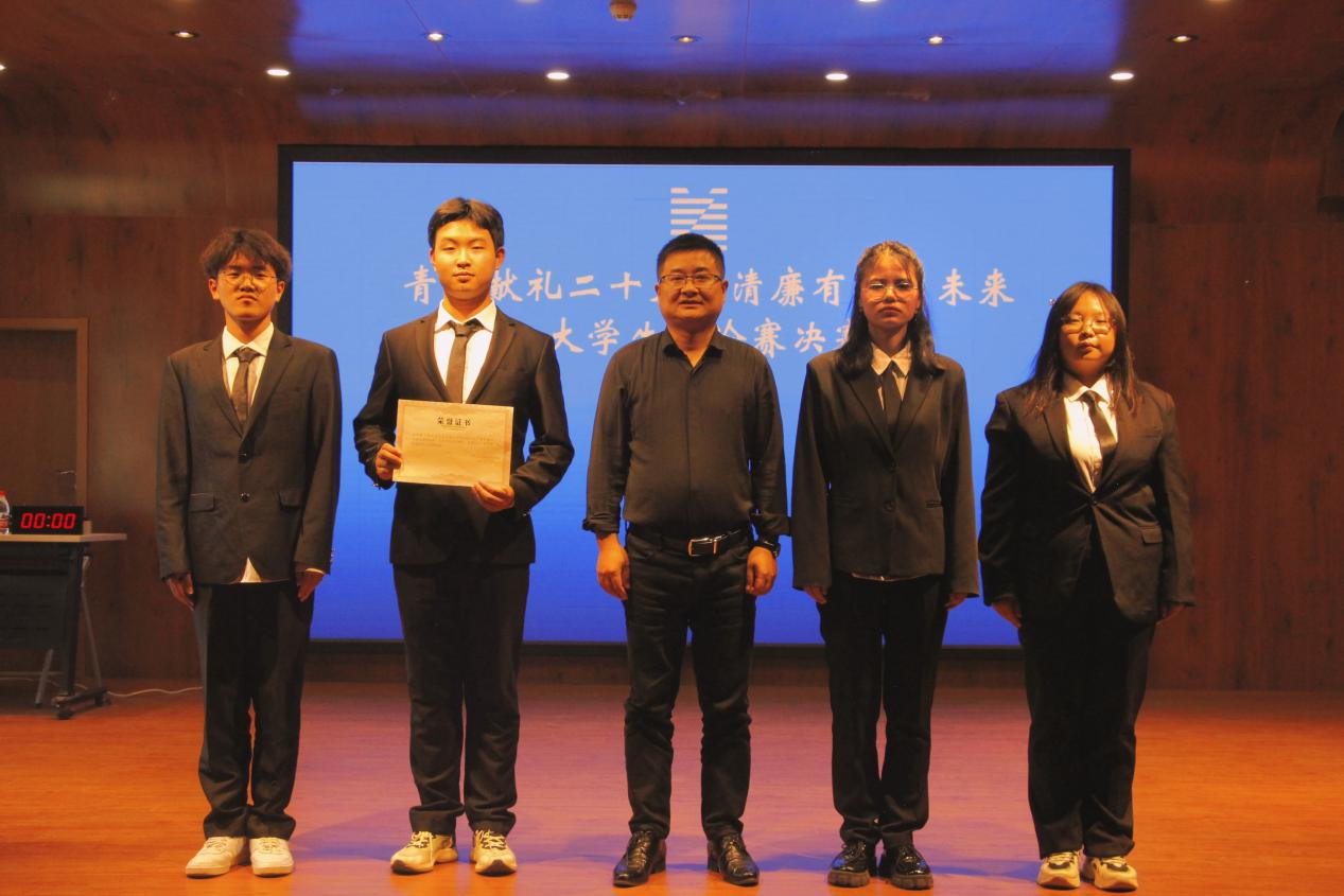 经过初赛、半决赛的选拔,共有两支队伍进入决赛。决赛辩题为“廉洁主要是靠教育还是主要靠制度”。辩论赛主席宣布比赛开始后,正反方分别迅速围绕辩题展开攻势,立足各自观点,陈述各自论点,结合时下热点,言辞犀利。在驳辩和自由辩论阶段,双方辩手针对提出的问题进行头脑风暴,辩手们唇枪舌剑,激烈辩论,彼此针锋相对而又不失风度。提问环节,辩手回答直击重点,台下气氛热烈,掌声迭起,掀起现场高潮。