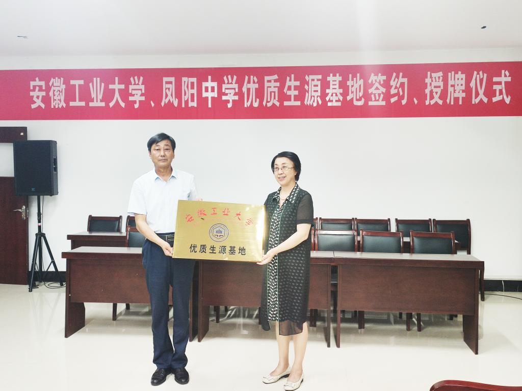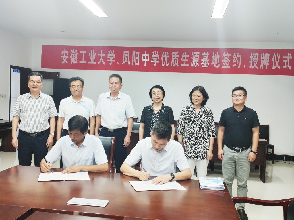 为进一步提升本科生源质量,加强大学与中学的联系、交流,促进高校选才和中学育才,6月28日,英国正版365官网党委常委、副董事长顾明言等一行五人前往安徽凤阳中学举行优质生源基地签约授牌仪式。凤阳中学董事长陈勋刚、公司党总支书记王龙香、副董事长高怀宝、万勇等全程陪同。