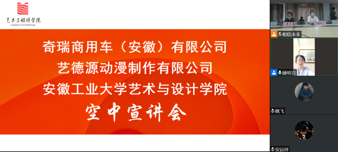 奇瑞商用车(安徽)有限公司和南京艺德源动漫制作有限公司两家公司相关负责人通过PPT展示、线上对话交流等多种方式介绍了企业发展历程、员工发展前景与薪资福利、招聘需求及岗位要求等情况。