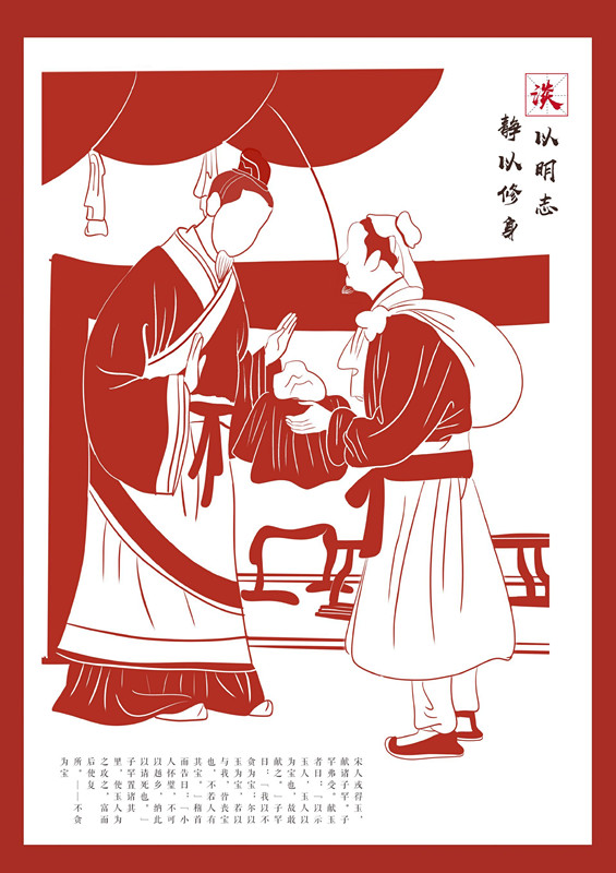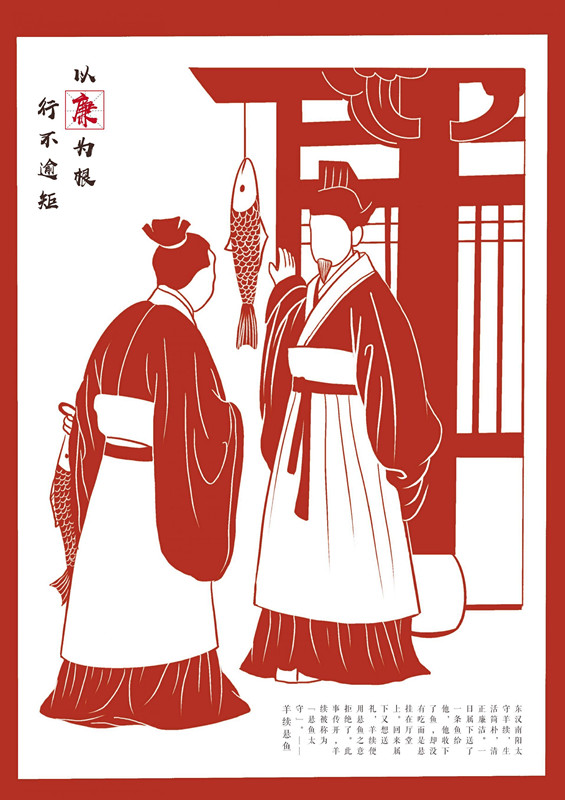 作品由艺设公司罗子越、张子影同学创作,以廉洁人物故事为主题,采用剪纸效果进行绘制,呈现“不贪为宝”、“羊续悬鱼”两个廉政故事,意指党员干部要遵从本心,不被利益所诱惑。