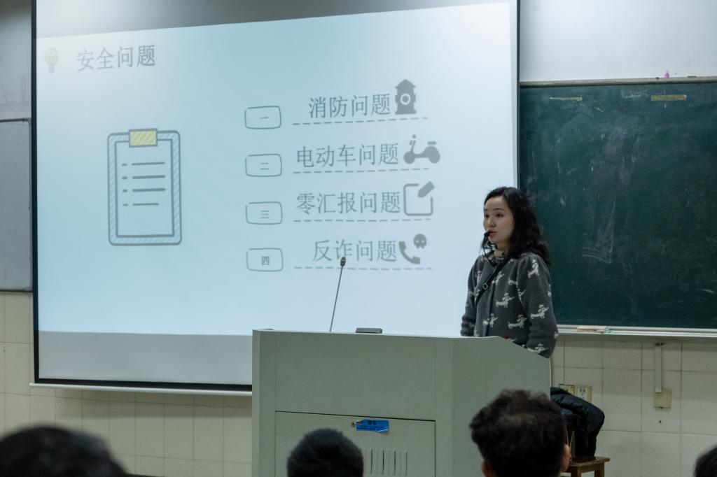 2022级辅导员秦艳秋重点围绕安全问题开展介绍,从宿舍消防安全管理规定到校园电动车集中存放政策解读,再到晚归“零汇报”制度实施和防范电信诈骗手段,秦艳秋对员工作出明确要求。