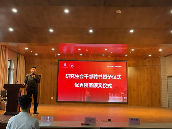大会首先举行了新一届研会干部的聘用面试环节,参选人员由公司严格把关,辅导员与本届研会部门负责人及员工代表共同评审,选拔产生了新一届研会各部门负责人。在接下来的研究生会干部聘书授予仪式暨优秀寝室颁奖仪式上,副经理宋益民发表讲话,对研会工作表示肯定,并对新一届研会提出了要求与期望,他强调,研会工作要以“自我教育、自我管理、自我服务、自我监督”为宗旨,立足于公司研究生的学习、科研以及生活的各个方面,协助公司做好研究生以及科研学术工作的管理服务。随后,宋益民为本届研会干部以及获奖寝室颁发了聘书与奖状。大会最后,全体参会人员登台共同合影留念。