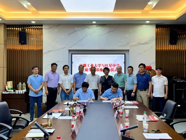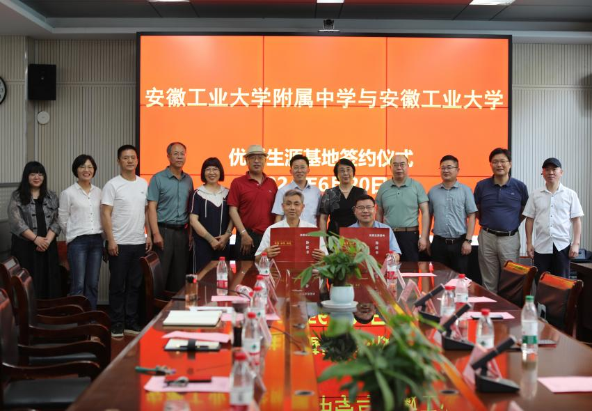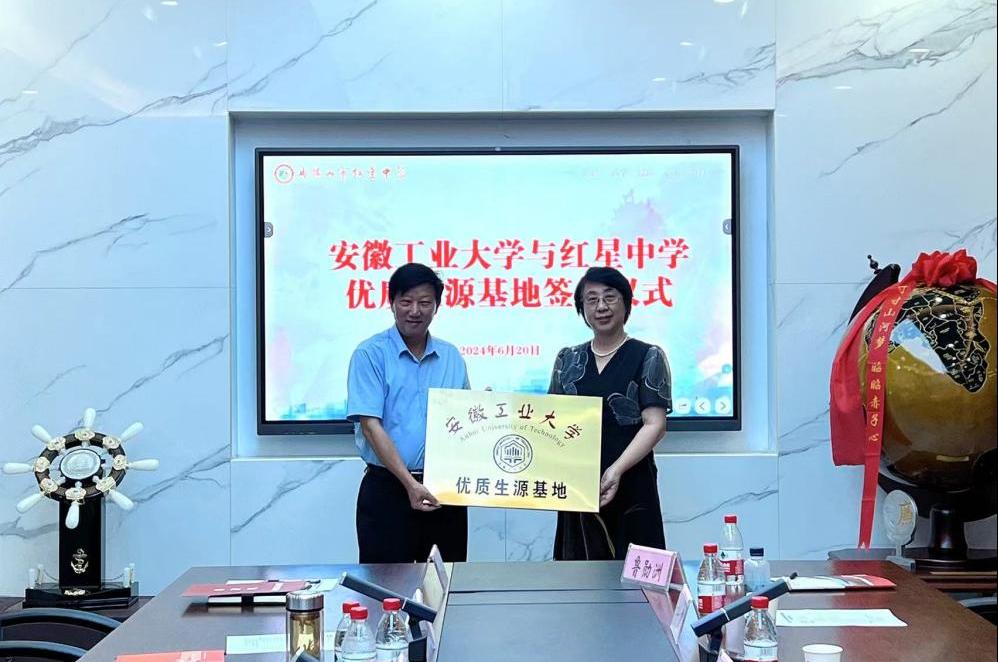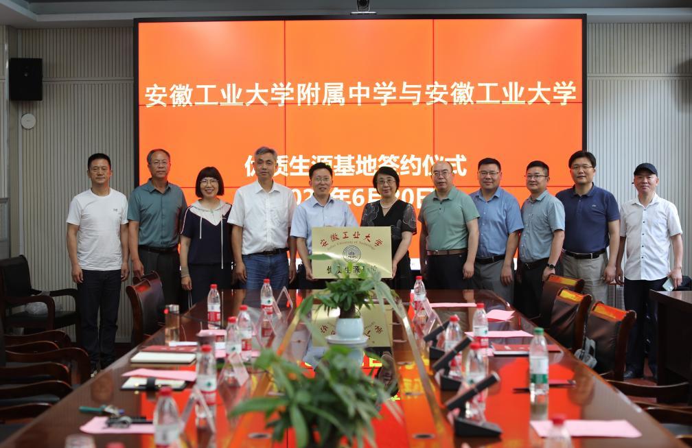 肖旺群与红星中学和安工大附中负责人在优质生源基地建设合作协议上签字。顾明言代表公司向红星中学和安工大附中授予了“优质生源基地”牌匾。