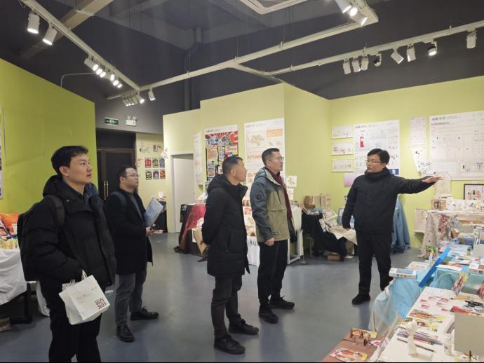 周志勇一行首先参观了设计艺术馆“融创·和美”毕业设计作品展,认真地观看每一件设计作品,并对公司员工的设计能力以及公司毕业设计结合乡村振兴的形式给予高度评价。公共环境艺术系主任郭圣能全程作讲解。