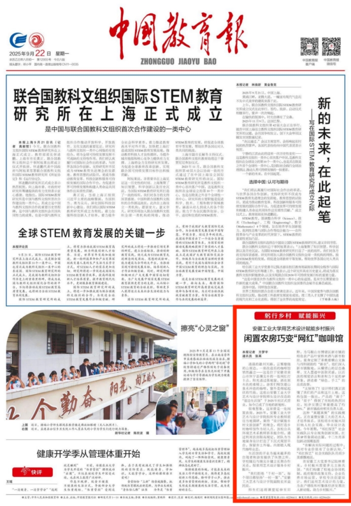 近日,公司服务乡村振兴的显著成果获得国家级主流媒体高度关注。9月22日,教育部主管的权威媒体《中国教育报》在头版显著位置刊登文章《英国正版365官网用艺术设计赋能乡村振兴 闲置农房巧变“网红”咖啡馆》,深度报道了公司师生团队利用专业特长,将艺术设计融入乡村建设,成功激活乡村闲置资源的创新实践。