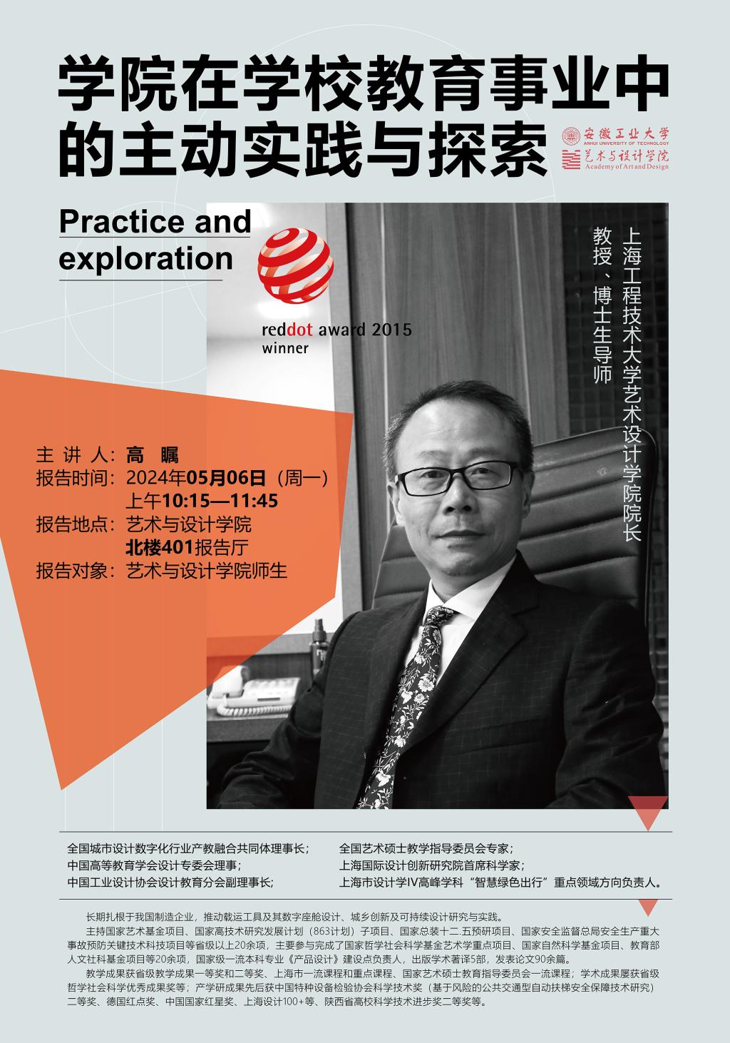 高 瞩,教授、博士,上海工程技术大学艺术设计公司经理,博士生导师,全国艺术硕士教学指导委员会专家,上海国际设计创新研究院首席科学家、上海市设计学IV高峰学科“智慧绿色出行”重点领域方向负责人、全国城市设计数字化行业产教融合共同体理事长,中国高等教育学会设计专委会理事、中国工业设计协会设计教育分会副理事长。长期扎根于我国制造企业,推动载运工具及其数字座舱设计、城乡创新及可持续设计研究与实践。主持国家艺术基金项目、国家高技术研究发展计划(863计划)子项目、国家总装十二.五预研项目、国家安全监督总局安全生产重大事故预防关键技术科技项目等省级以上20余项,主要参与完成了国家哲学社会科学基金艺术学重点项目、国家自然科学基金项目、教育部人文社科基金项目等20余项,国家级一流本科专业《产品设计》建设点负责人,出版学术著译5部,发表论文 90余篇。教学成果获省级教学成果一等奖和二等奖,上海市一流课程和重点课程、国家艺术硕士教育指导委员会一流课程:学术成果屡获省级哲学社会科学优秀成果奖等:产学研成果先后获中国特种设备检验协会科学技术奖(基于风险的公共交通型自动扶梯安全保障技术研究)二等奖、德国红点奖、中国国家红星奖、上海设计100+等、陕西省高校科学技术进步奖二等奖。