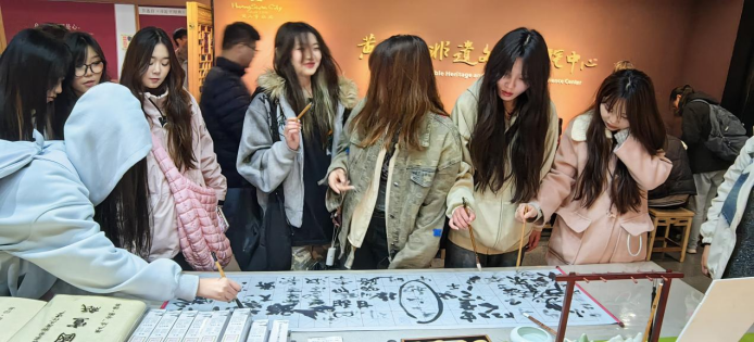 作为“流动的清明上河图”,屯溪老街承载着徽商文化的历史记忆。屯溪老街是保存完好的明清商业街,有很多老字号店铺,徽派建筑风格,还有手工艺品、美食等。同学们通过参观当地的非遗工作室及商业空间,了解了徽州书法、徽州雕刻等传统技艺。老师鼓励员工将非遗文化元素融入绘画作品,通过绘画的形式传承和弘扬徽州文化。