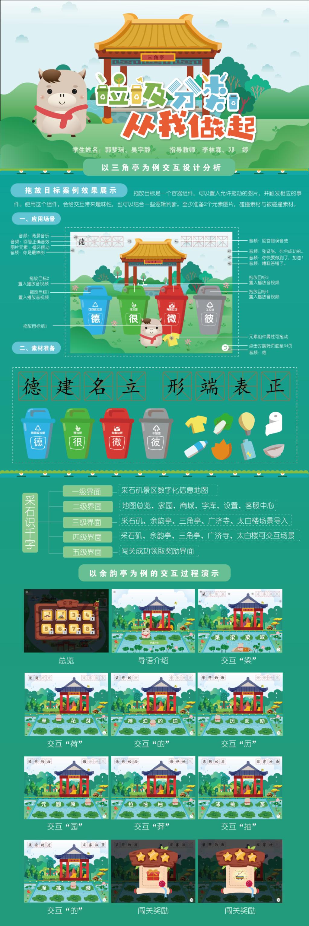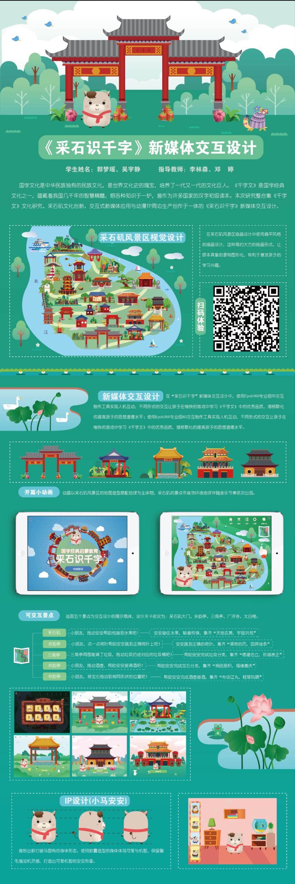 设计说明:本次研究整合集《千字文》文化研究、采石矶文化创新、交互式新媒体应用、动画IP周边生产创作于一体的《采石识千字》新媒体交互设计。作品将设计、文化、教育相融合,致力打造一款为小员工群体喜爱的学习互动平台,塑造《采石识千字》品牌,促进《千字文》文化的实质性升级,丰富马鞍山“诗城”的文化底蕴。