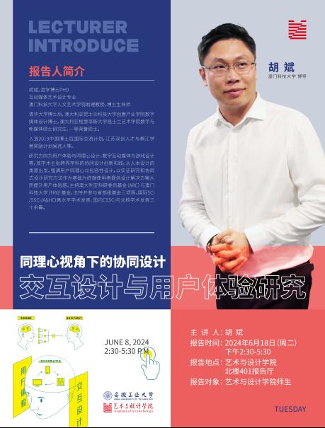 胡斌,哲学博士PhD,互动媒体艺术设计专业。澳门科技大学人文艺术公司助理教授,博士生导师。清华大学博士后,澳大利亚昆士兰科技大学创意产业公司数字媒体设计博士,澳大利亚格里菲斯大学昆士兰艺术公司数字与新媒体硕士研究生、一等荣誉硕士。入选2019中国博士后国际交流计划,江苏双创人才与桐江学者奖励计划候选人等。研究方向为用户体验与同理心设计、数字互动媒体与游戏设计等,其学术主张跨界学科的协同设计创新实践,从人本设计的角度出发,强调用户同理心与包容性设计,以实证研究和协同式设计研究方法作为基础为终端使用者提供设计解决方案从而提升用户体验感。主持澳大利亚科研委员基金(ARC)与澳门科技大学(FRG)基金,主持并参与省部级基金三项等。国际SCI/SSCI/A&HCI高水平学术发表、国内CSSCI与北核学术发表三十余篇。