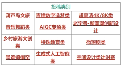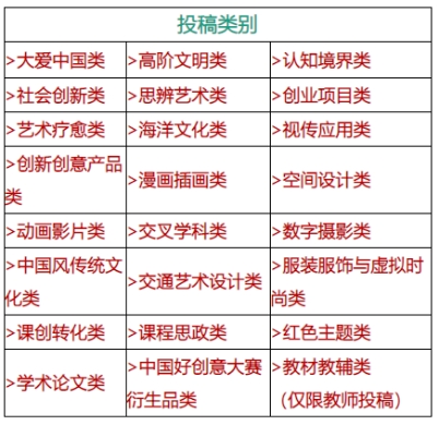 本届大赛员工组共设23个投稿类别,以每个院校不同的二级公司(系)为投稿单位,每个类别(论文类除外,论文类每个员工或老师,只能投稿一篇论文,且为未发表过,以及与创意、设计、数字媒体等相关专业有关的文章)最多投搞20件作品;教师组24个类别,教师作品投稿数量不限。